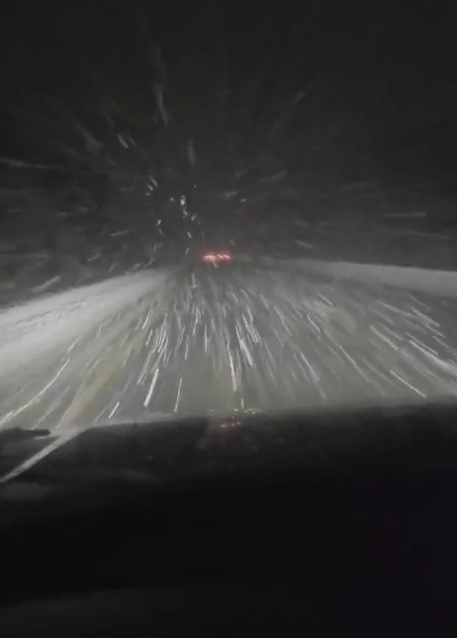 The video depicts a car driving on a snow-covered road at night during a blizzard