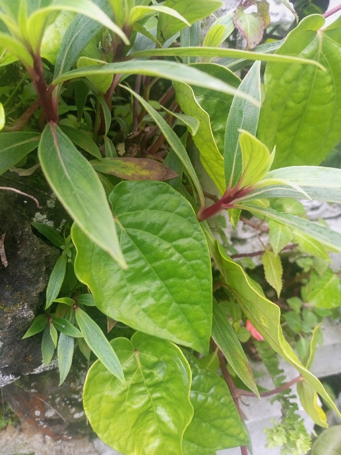 The image displays a close-up, vertical shot of dense green foliage in the city of Zee Pin Kone, Myanmar. The central focus is a cluster of large, prominent, heart-shaped green leaves with distinct venation, indicative of a betel plant. Interspersed among these are numerous elongated, lanceolate green leaves, some exhibiting lighter edges, originating from plants with noticeable reddish-brown stems. Smaller, lighter green leaves and stems are visible throughout the composition, suggesting diverse plant growth. To the immediate left, a dark, textured surface, possibly rock or concrete with moss, is partially visible. The background consists of blurred lighter tones, consistent with an out-of-focus wall or structure, suggesting an outdoor or garden setting. No human figures or discernible actions are present.