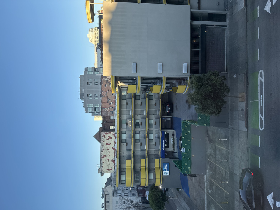 A vertical shot captures a cityscape with a clear blue sky. Buildings of varying heights and styles are present, including a Best Western hotel featuring yellow accents. Graffiti art is visible on one building's side. The street below shows parking spaces, a painted bike lane, trees, and parked cars. The composition focuses on the interplay between urban architecture and the surrounding environment.