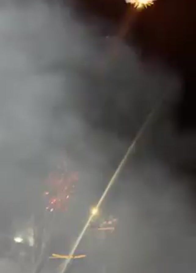 fireworks display at night. A dark wall is visible in the foreground. Fireworks explode in the sky, creating colorful bursts of light. Smoke fills the air. The camera is pointed upward. Bright, golden fireworks fill the sky, followed by smaller bursts of red and white. The sound of the explosions can be heard. The scene is festive and celebratory.