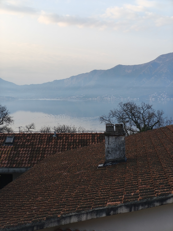 The image displays an elevated view of Donji Orahovac, Montenegro. In the foreground, two distinct roofs are visible. The lower roof, closest to the viewer, is covered with reddish-brown terracotta tiles and has a concrete eave at its bottom edge. Immediately behind and slightly above, a second roof, also tiled with terracotta in a slightly lighter shade, features a weathered grey concrete chimney with two square flue openings positioned centrally to the right. A rectangular skylight is present on the left side of this second roof. Between the roofs and the water, bare, deciduous tree branches are visible on both the left and right sides of the frame. The midground consists of a calm, expansive body of water, likely a bay, exhibiting subtle horizontal ripple patterns across its surface and reflecting the pale sky. Along the distant shoreline of the water, a scattering of small, light-colored buildings is discernible, indicating a coastal settlement. In the background, a range of mountains rises abruptly from the water's edge, appearing blue-grey due to atmospheric haze or mist. The sky above is a pale blue, transitioning to white near the horizon, with sparse, wispy white clouds. No individuals, actions, or specific interactions are depicted.