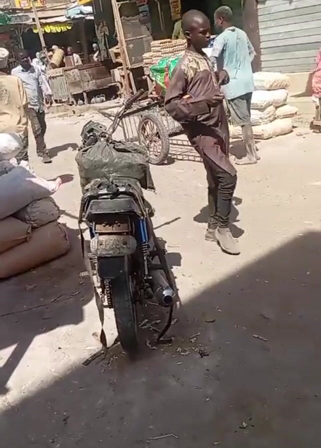 busy outdoor market scene, likely in an African country, during the daytime. The ground is dusty and partially covered with debris. Several people are walking around, some carrying items. A motorcycle with bags strapped to the back is parked in the foreground. To the left are stacks of large white sacks, possibly containing goods for sale or transport. A wooden structure with wire mesh is also visible nearby. In the background, more people can be seen interacting in front of market stalls under awnings. The overall atmosphere is active and commercial.