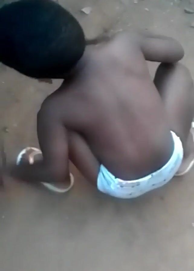A young, dark-skinned child wearing a diaper and sandals is sitting on the ground. The child's back is facing the camera. The ground is dirt and there are some small rocks nearby. The child is holding a small stick. The background is blurry, but there appears to be some vegetation.