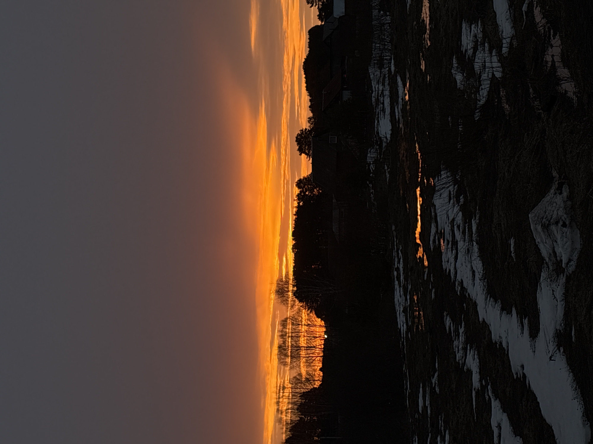 landscape at sunset. The sky is a gradient of orange and grey. Silhouetted trees and possibly buildings are visible against the bright sky. In the foreground, the ground appears to be partially covered with snow or ice, with patches of dark vegetation. Reflections of the sunset can be seen in puddles or wet areas on the ground. The image is a natural landscape, with no people visible. The prompt specifies the image is from Rusalevka, Russia, but this information cannot be verified from the visual data alone.