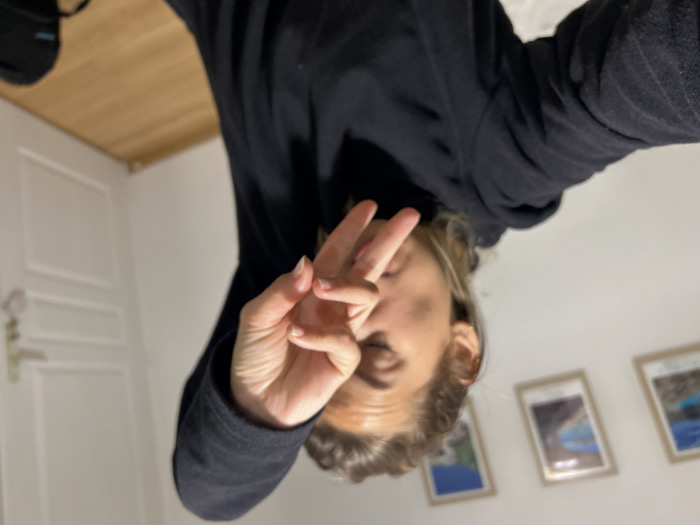 A person wearing a black shirt makes a peace sign with their right hand. The background includes a white door with a silver handle on the left, and three framed pictures on the right. The background wall appears white. Part of a wooden surface can be seen in the upper left corner, with a black object on it. The image is upside down.
