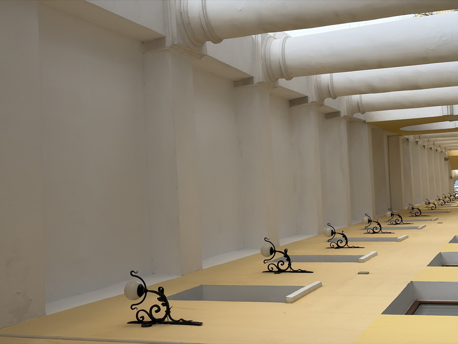 The image depicts an architectural colonnade in Kronstadt, Russia, viewed from a low, upward-looking perspective along its longitudinal axis. To the left, a pale yellow building facade displays a series of rectangular window apertures with white sills and, positioned above or between them, ornamental black wrought-iron wall lamps each fitted with a spherical white glass globe. To the right, a sequence of light-colored, classical columns supports a flat, cream-toned ceiling structured by parallel transversal beams. The scene is devoid of human figures or dynamic activity.