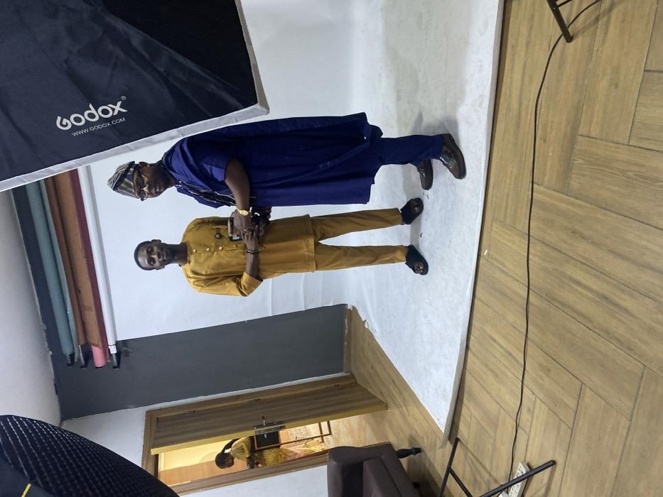 Two men stand on a white platform within a photo studio setting. The taller man wears a blue traditional robe and matching hat, while the shorter man is in a gold-colored suit. Both men face forward with serious expressions. Studio equipment, including a large softbox, are visible. A doorway in the background shows a glimpse of a room interior. The floor outside the platform is covered with light wood-tone planks.
