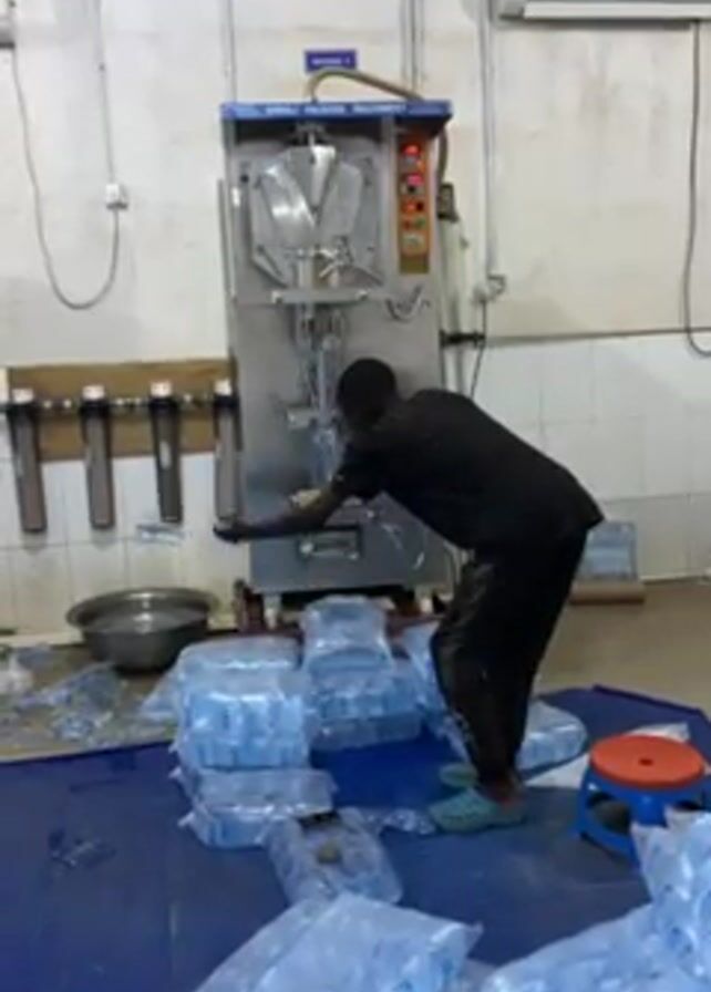 A man is operating a water pouch filling machine in what appears to be a small factory or production facility