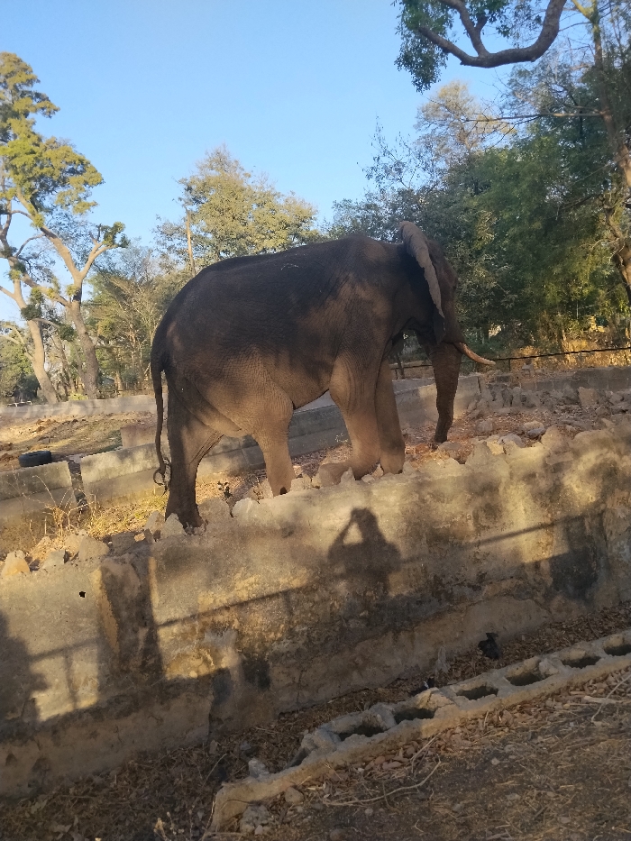 An adult elephant, dark grey with prominent tusks and large ears, stands in an enclosure in Garun Gawa, Nigeria. The animal is positioned in the midground, oriented towards the right, with its right front leg slightly elevated. Its immediate environment consists of dry, uneven earth with scattered vegetation and debris. A weathered concrete barrier runs horizontally across the foreground, separating the viewer's perspective from the elephant's area. The shadow of a human figure, holding what appears to be a camera or phone, is clearly cast upon this concrete barrier. A black, discarded tire lies on the ground to the left of the elephant. The background displays a clear blue sky above a dense arrangement of trees, indicating an outdoor setting. Sunlight, originating from the left, creates distinct, elongated shadows across the scene.
