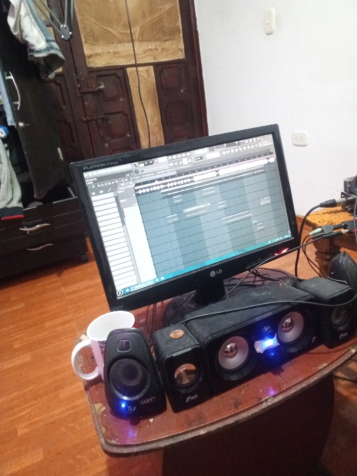 An LG monitor displays music production software on a wooden desk. Speakers, with glowing blue lights, are arranged in front of the monitor, alongside a white mug. The desk appears worn. In the background, there's a dark-colored wardrobe, drawers, and a white wall with an electrical outlet. A brown, paneled door is also visible. The room appears to be in a residential setting.