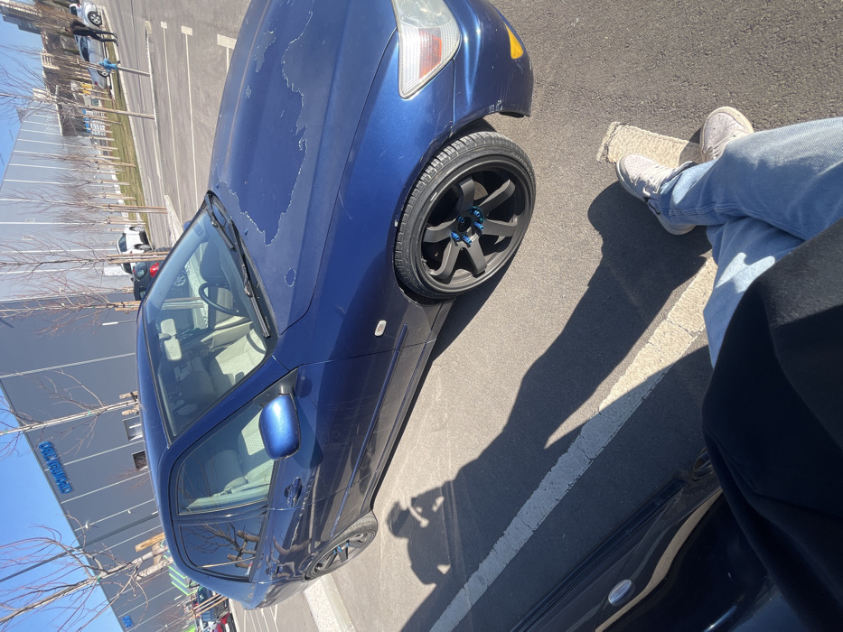 The image captures an outdoor parking lot scene on a clear, sunny day in Sofia, Bulgaria, in front of a large retail establishment identified as "СПОРТЕН СВЯТ" (Sporten Svyat) via prominent signage on its grey, corrugated metal building. In the immediate foreground, the lower legs and feet of a person are visible, clad in light blue jeans and light grey sneakers. The individual is positioned on the asphalt, with a dark fabric garment covering their upper legs. A long, distinct shadow of a person, consistent with someone holding a camera or phone, is cast across the ground, bisecting a white painted parking line. The central subject is a dark blue four-door sedan, identifiable as a Lexus IS-series or Toyota Altezza, parked within a marked space. The vehicle exhibits significant paint degradation on its hood, characterized by extensive peeling of the clear coat and underlying color coat. Minor scratches and scuff marks are visible on the front passenger-side bumper and along the passenger-side body panel. The car is equipped with aftermarket dark grey, multi-spoke alloy wheels, secured with blue lug nuts. The interior upholstery is a light, possibly beige, fabric. The background features numerous bare deciduous trees planted in rows throughout the paved parking area. Several other vehicles are parked or in transit further in the distance, including a white SUV. The sky is clear blue, indicating bright daylight conditions that cast sharp shadows.