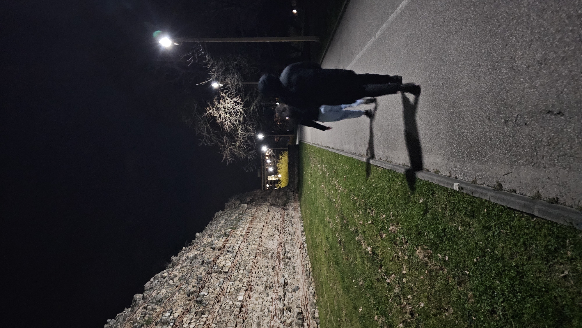 nighttime scene in Hisarya, Bulgaria. A partially ruined stone wall runs along the lower left side of the image, alongside a green grassy area. A paved path runs parallel to the grass and wall. Two indistinct figures are walking along the path. Shadows cast by the figures suggest illumination from a nearby light source. Streetlights are visible further down the path, illuminating bare tree branches. A building with yellow lights appears in the distance. The sky is dark.