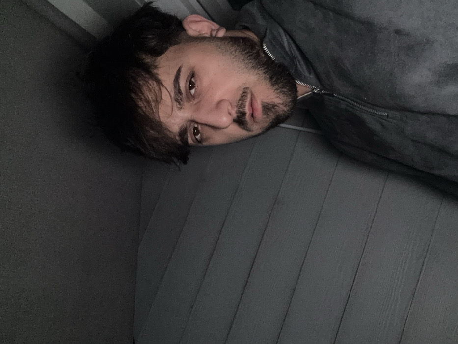 - "A man with dark hair and a beard rests his head on gray paneling, possibly a wall or floor" by FM-xKTK43, licensed under CC BY 4.0