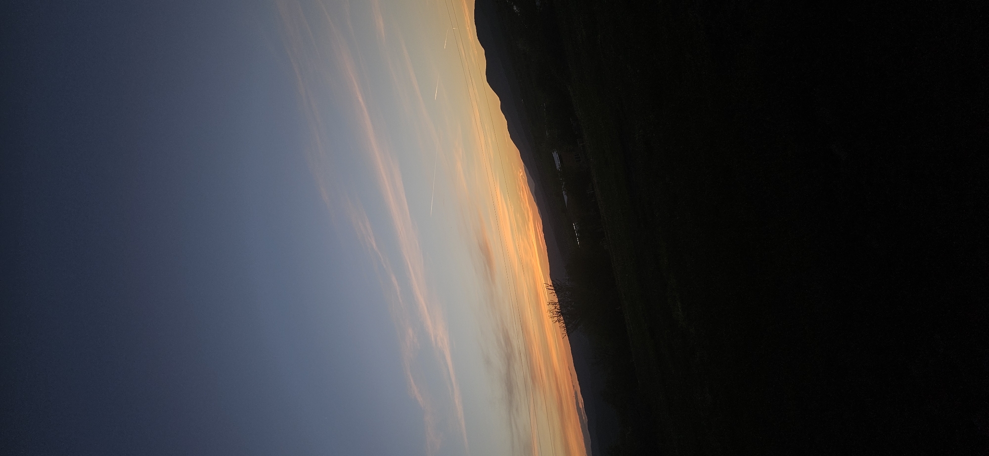 The image depicts a landscape at sunset in what is likely the city of Momin Prohod, Bulgaria, or near it. To the left, the sky is a gradient of dark blue to orange with thin, elongated clouds. Contrails from airplanes are visible. Power lines run through the sky. To the right, the land is dark with the outline of a hill or mountain. In the middle is a transition from light to dark. Some details suggest the presence of trees and possibly water.