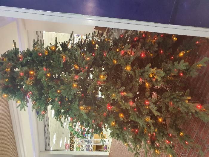 An artificial Christmas tree, approximately 2-3 meters in height, stands indoors within a commercial establishment