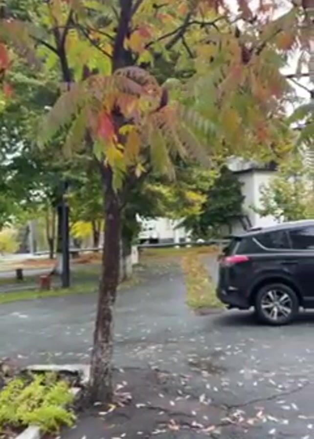 cloudy day in an outdoor setting. A small tree with leaves showing fall colors (green, red, yellow) stands in the foreground, next to a patch of green ground. Behind the tree is a black SUV parked on an asphalt surface covered with fallen leaves. In the background, there's a white building with a faded or damaged wall. The building sits adjacent to a grassy field with scattered trees. A long, metal pipe runs along the edge of the asphalt and separates it from the grass. The overall atmosphere suggests a quiet, possibly rural or suburban, area in autumn.