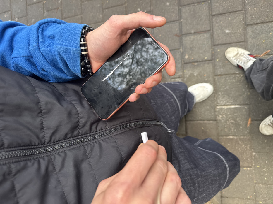 The scene depicts a person, viewed from the chest down, engaged in an activity outdoors in Tel-Aviv, Israel, on a paved surface. The individual wears a black quilted vest, a blue long-sleeved shirt, dark blue jeans, and white sneakers, with the right shoe featuring a red and green stripe detail. Two beaded bracelets, one black and one black with white stripes, are visible on the right wrist. The person's right hand holds a red-framed smartphone with a visible crack on its screen. On the smartphone screen, a single line of white powdery substance is present. The individual's left hand holds a small, white, cylindrical object, consistent with a rolled-up bill or cut straw, positioned near the substance on the phone screen, indicating preparation for insufflation. Reflections on the phone screen show tree branches and what appears to be an overcast sky. The ground beneath the person consists of grey rectangular interlocking pavers.