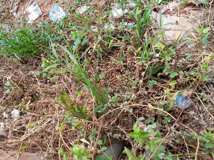 The image displays an outdoor scene located in the city of Unknown, Unknown, focusing on an area of unkempt ground. The scene is devoid of people, actions, or interactions. The ground consists of exposed reddish-brown soil mixed with a dense accumulation of vegetation and litter. Dominant features include various types of green weeds, some with small white or light-colored buds, intermingled with a significant amount of dry, straw-like dead plant material. Scattered throughout the debris are multiple pieces of refuse. Specifically, several crumpled white pieces of paper or plastic are visible in the upper-left quadrant, and a blue crumpled plastic object, possibly a bottle or bag fragment, is present in the lower-right quadrant. A dark, cylindrical object, possibly a pipe, is partially visible in the bottom-center. The environment suggests a neglected or undeveloped outdoor space.