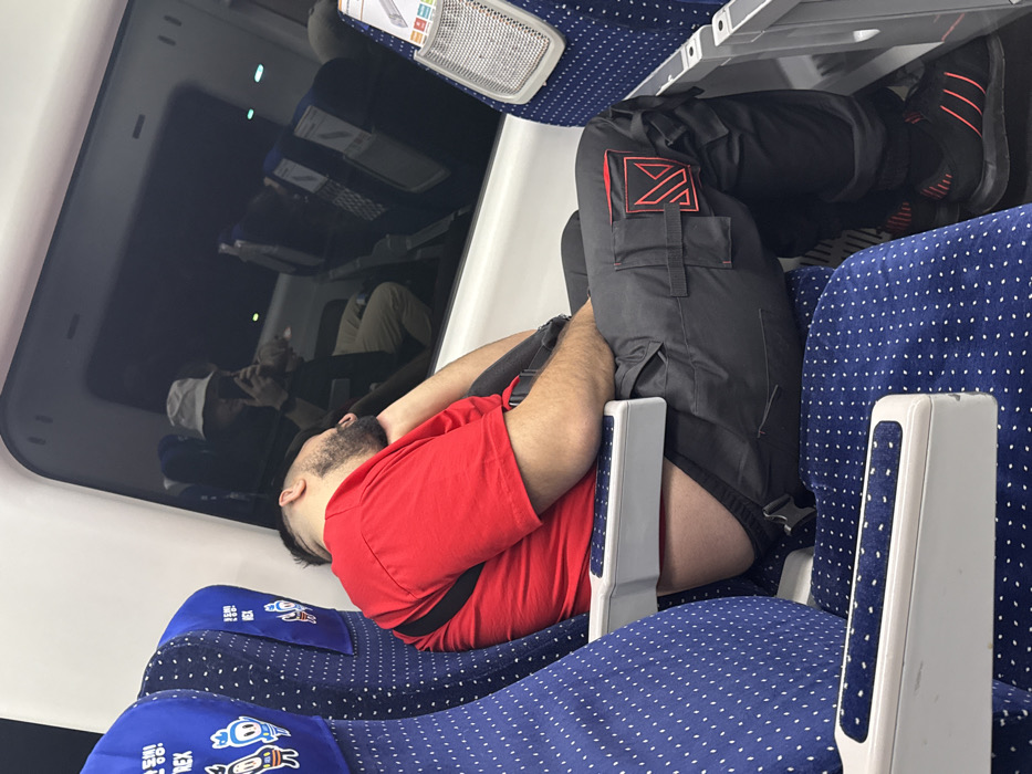 The image captures the interior of a train carriage, identified by "REX" branding on blue, white-polka-dotted seat upholstery, indicating the Airport Railroad Express (AREX) in Incheon, South Korea. A male individual is depicted in the foreground, asleep or resting in a window seat, his head supported by his right hand and arm. He wears a red short-sleeved t-shirt, black tactical-style cargo pants with red accents and a logo on the right thigh, and black athletic shoes with red stripes. A black strap is visible across his chest. His bare midriff is exposed between his t-shirt and pants. Reflected in the dark train window, a second individual wearing a light-colored bucket hat holds a smartphone, appearing to photograph the scene. Additional blue, polka-dotted train seats are visible in the reflection.