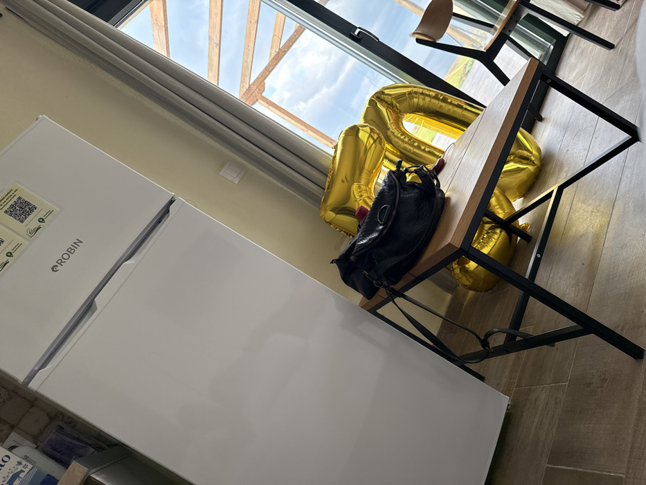 The image depicts an indoor scene in Alonia, Greece, featuring a white two-door "ROBIN" brand refrigerator positioned against a light-colored wall on the left. Energy efficiency labels and a QR code sticker are affixed to the upper door of the refrigerator. In the foreground, a rectangular table with a light wooden top and a black metal frame is situated. A black, textured leather shoulder bag rests on this table. To the right of the table, a collection of large, inflated gold foil balloons, including at least one shaped like a '0', are visible on the floor and leaning against a large, black-framed sliding glass door or window. Through this window, an overcast sky with white clouds, a distant green landscape, and exterior wooden structural beams are visible. Grey curtains are partially drawn on the left side of the window. A light-colored chair with a wooden seat and backrest and black metal legs is positioned to the right of the table, near the window. The floor is covered with light brown/grey tiles exhibiting a wood-grain pattern. A white electrical outlet or switch is visible on the wall between the refrigerator and the window. No individuals are present.
