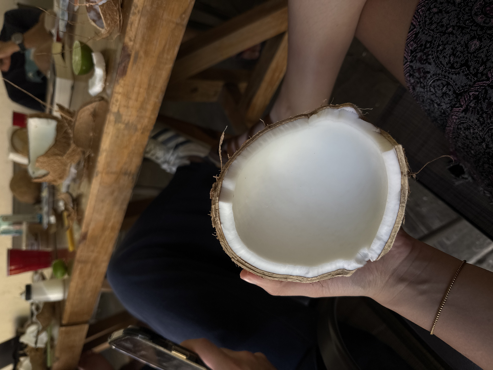A person holds a halved coconut in their right hand. The coconut is cut cleanly in half, with the white flesh exposed. The person is wearing a thin gold bracelet on their wrist. Other halved coconuts are on a wooden table in the background along with some green limes, other cut fruit and various bottles. The table is in disarray. The wooden slats that make up the table appear rustic. The environment suggests a market or a vendor's setup, perhaps in Puebla, Mexico.