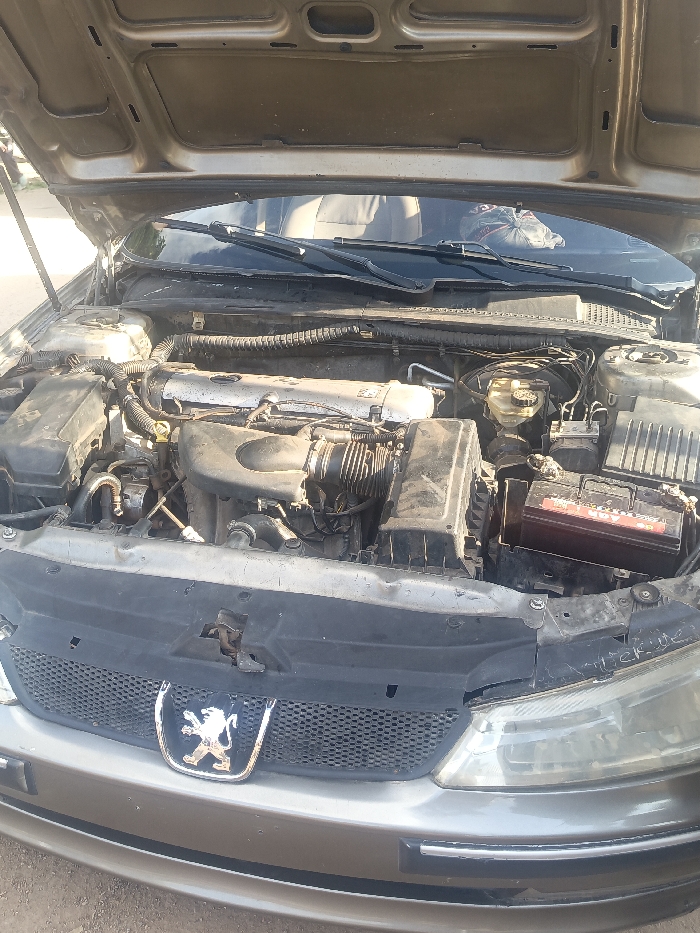 - "The image displays the front view of a beige or light brown Peugeot sedan with its hood fully open, revealing the engine compartment" by FM-sjbDs2, licensed under CC BY 4.0