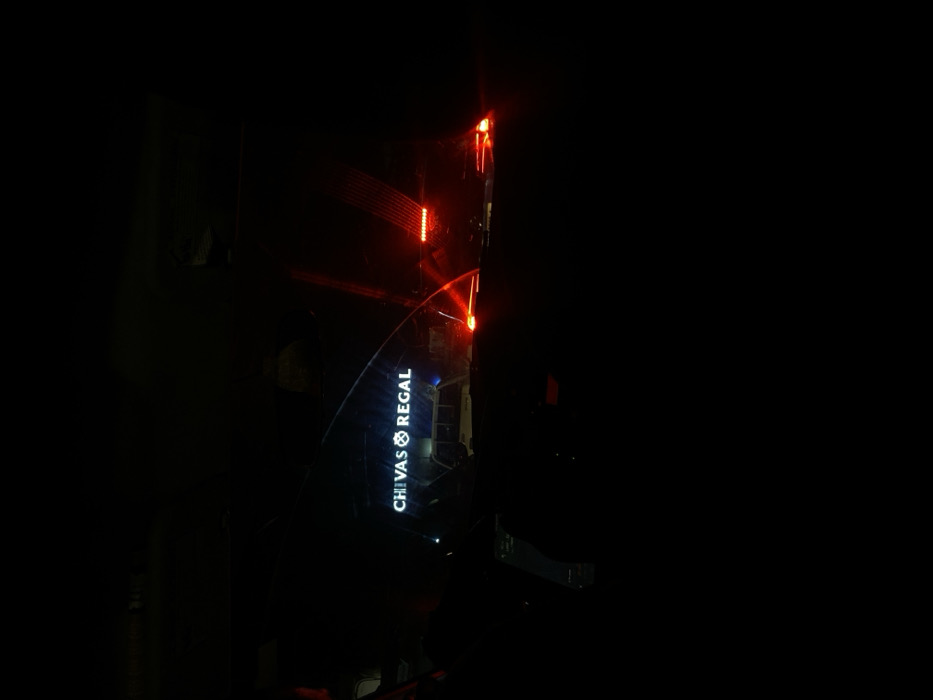 The image captures a nighttime urban scene in Ilado, Nigeria, viewed from the interior of a vehicle looking forward through its windshield. A prominent, illuminated white sign displaying "CHIVAS REGAL" and its logo is centered, showing some reflection. Beneath the sign, a light-colored vehicle, possibly a white pickup truck, is partially discernible. Further ahead, multiple red vehicle taillights are visible, including a distinct horizontal array of red LEDs and two individual red lights. Red light streaks are present, consistent with reflections on the windshield or distant light sources. The immediate foreground reveals the dark, indistinct dashboard or interior of the observer's vehicle. The background is overwhelmingly dark, offering no clear details of structures or environment. No individuals or specific actions are identifiable.