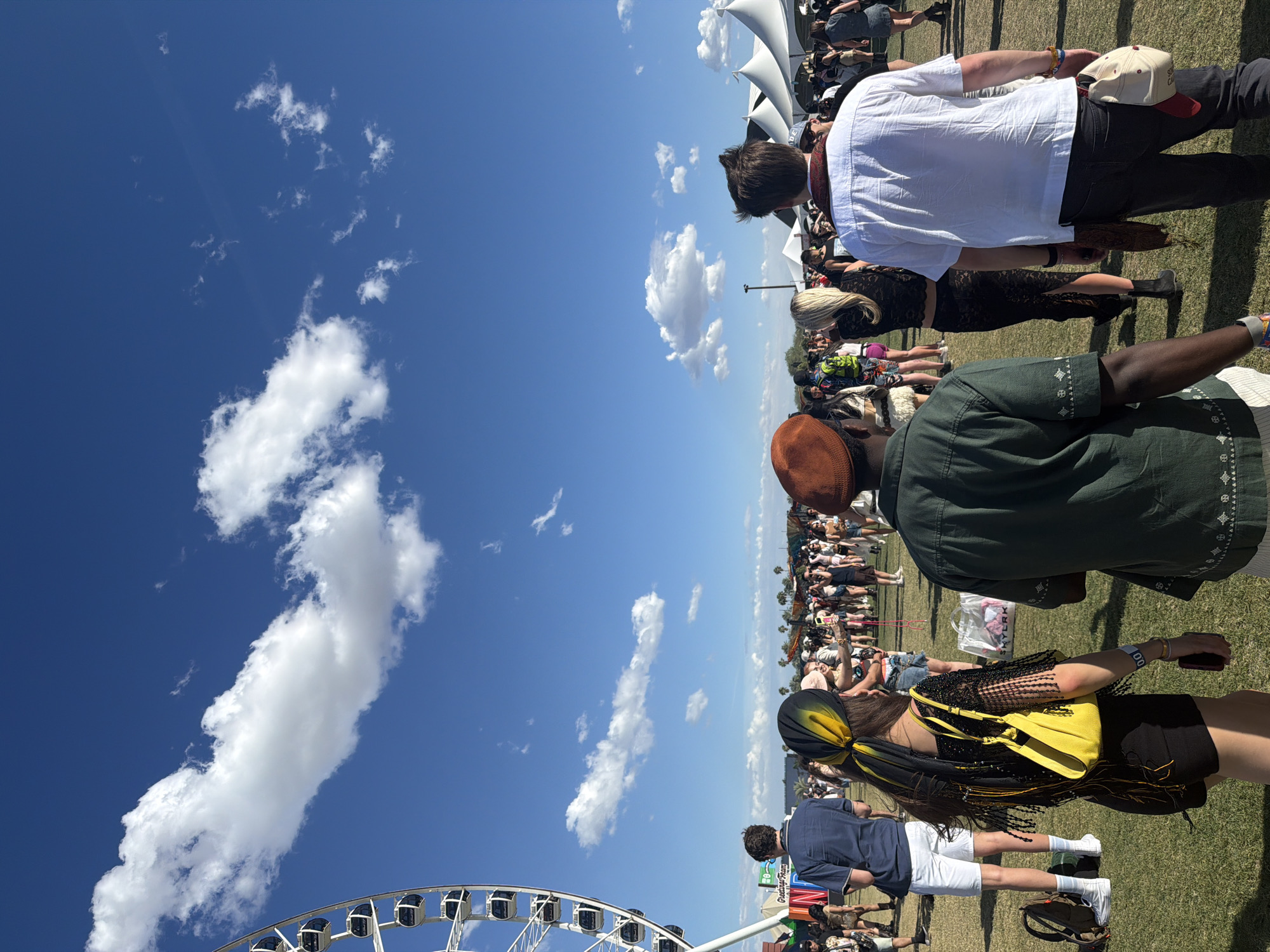 The image depicts a daytime outdoor scene in Indio, United States of America, likely at a festival or event. A large Ferris wheel is visible in the lower left corner against a backdrop of a bright blue sky dotted with puffy white clouds. Numerous people are present, suggesting a crowded gathering. Some individuals are standing, while others appear to be walking or moving through the area. They are dressed in various clothing styles, indicative of a casual outdoor event. In the immediate foreground, the backs of several people are visible, providing a close perspective of the crowd. The environment suggests an open space, possibly a field or park, as indicated by the presence of grass. In the background, large white tents or structures can be seen.