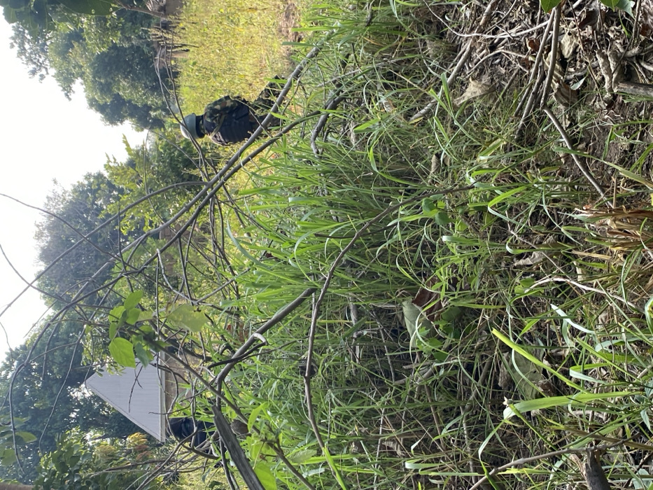 This image depicts an outdoor scene in Takum, Nigeria, dominated by dense vegetation. In the foreground and midground, tall green grass and a network of bare, tangled branches obscure much of the view. Two individuals are visible amidst the foliage. On the right, an individual wearing camouflage patterned fatigues and a light-colored helmet is positioned low, possibly kneeling or crouching, with their back to the viewer, facing towards the right side of the frame. On the left, a second individual, largely obscured by foliage and a distant structure, is discernible as a darker figure. In the left-mid background, a building with a white or light-colored, corrugated metal gable roof is partially visible behind trees and bushes. The overall environment is lush, with numerous trees and dense green foliage visible in the background under bright daylight conditions. The ground beneath the vegetation appears uneven, covered with dry leaves, twigs, and dirt.