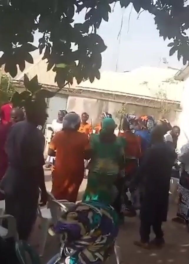A group of people are gathered in what appears to be a courtyard or outdoor area between buildings. Many of the women are dressed in brightly colored, patterned clothing and headwraps. Some of the men are wearing suits or traditional attire. The group seems to be moving and possibly dancing, though the view is partially obstructed by tree branches in the foreground. There are rows of white plastic chairs arranged in the space. The buildings around the courtyard appear to be single-story structures with corrugated metal roofs. The overall atmosphere seems lively and celebratory.