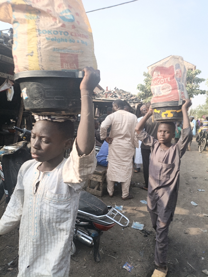 - "Two boys carry bags of cement on their heads in a bustling outdoor setting" by FM-Bh3W72, licensed under CC BY 4.0