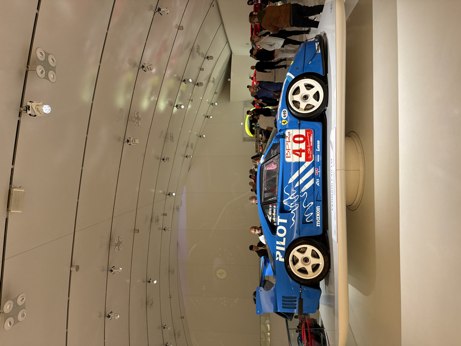 This image depicts the interior of the Museo Casa Enzo Ferrari (MEF) in Modena, Italy. A blue Ferrari F40 LM race car is centrally displayed on a raised white platform. The vehicle features white multi-spoke wheels, a large rear wing, and a livery with "PILOT" text on the side, a red circle with the number "40," "BPR The 25th Anniversary" branding, and various sponsor decals including "maxon" and "Lease." The museum hall exhibits a modern design with a high, arched white ceiling fitted with numerous track lighting fixtures. Approximately 20-30 individuals, primarily adults, are present in the background, observing the exhibits. Some are viewing the blue Ferrari, while others are distributed further into the brightly lit, open exhibition space. A distinct yellow structure, characteristic of the MEF's main building, is visible through an archway in the distant background.