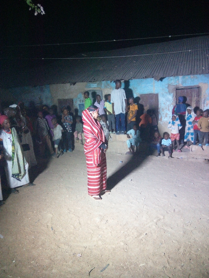 A woman in a red and white striped robe stands in a dirt yard surrounded by a crowd. The crowd includes men, women, and children. The woman is facing right. Behind the crowd is a building with a corrugated metal roof. The scene appears to be at night or in dim light. Some people are standing on the steps or platform of the building, while others are on the ground. The location may be a village or rural area.