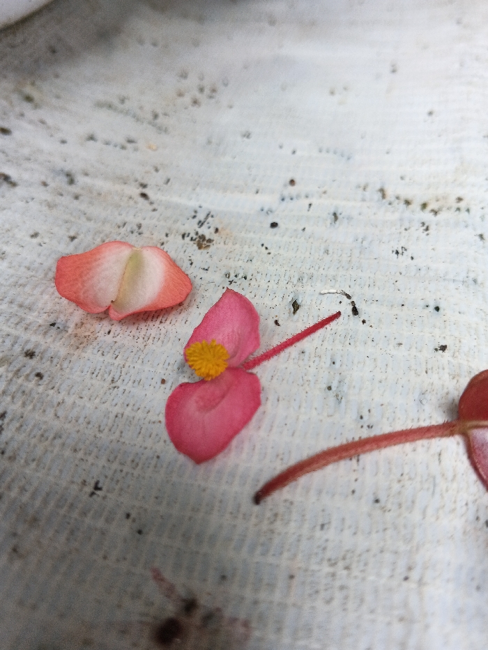 - "Scattered begonia flower parts rest on a mottled, weathered surface" by FM-Bx5Pj2, licensed under CC BY 4.0