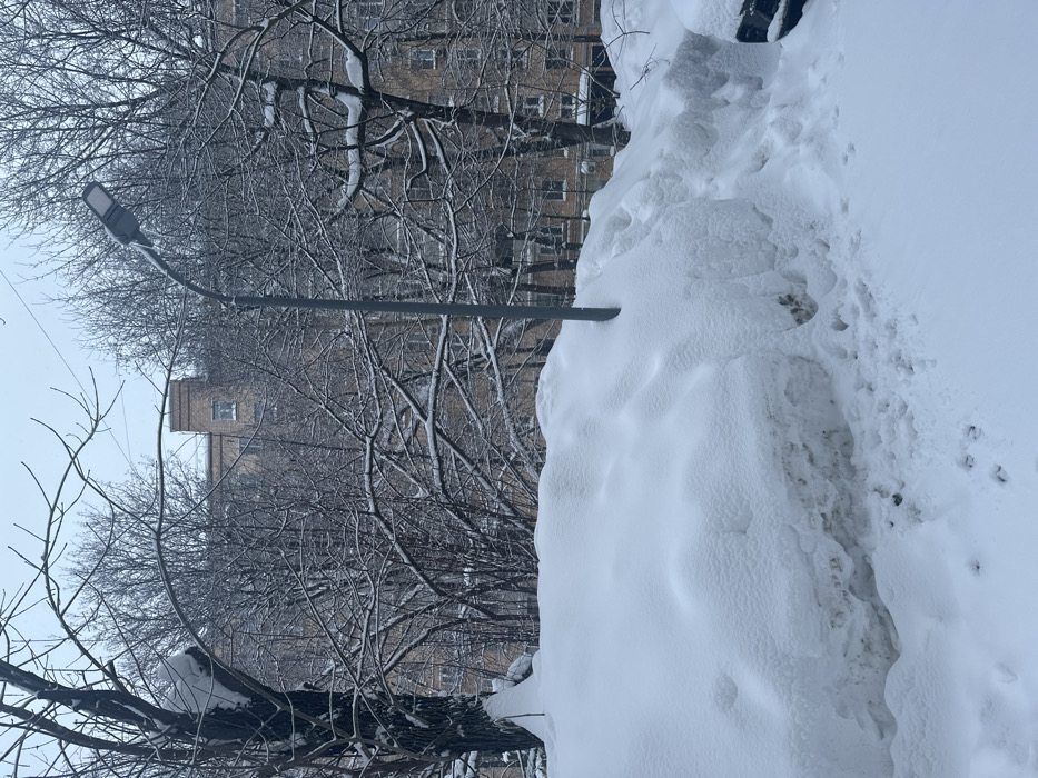 A winter scene captures a snow-covered landscape beside a building. Bare trees stand out against the backdrop of the building, their branches dusted with snow. A lamppost cuts through the scene, its simple design contrasting with the natural elements. Heavy snow cover creates a stark white foreground, partly obscuring what lies beneath. The muted colors and overcast sky contribute to the wintry atmosphere.