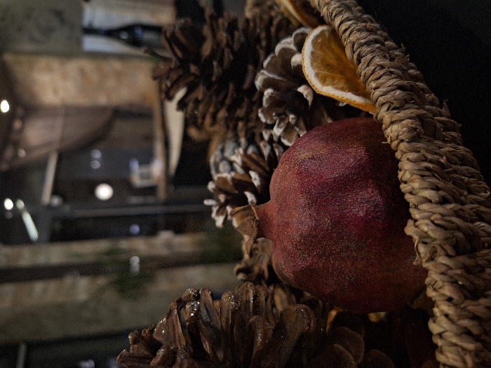 The scene depicts an indoor decorative arrangement located in Stara Zagora, Bulgaria. In the foreground, a prominent, dark red pomegranate is centered within a woven basket made of natural fibers. Surrounding the pomegranate and filling the basket are numerous brown pine cones of various sizes; some cones exhibit a glossy or wet appearance. A single dried orange slice, yellow-orange in color, is visible among the pine cones on the right side of the basket. The background, rendered out of focus, shows an interior space with architectural elements resembling stone or brick pillars on the left. Blurred ambient lights are visible throughout the background. A dark bottle, possibly of wine or spirits, is discernible on a surface in the mid-right background, and a dark, possibly sheer, fabric or curtain is faintly visible in the upper right. No individuals are present, and no actions or interactions are occurring within the static scene.