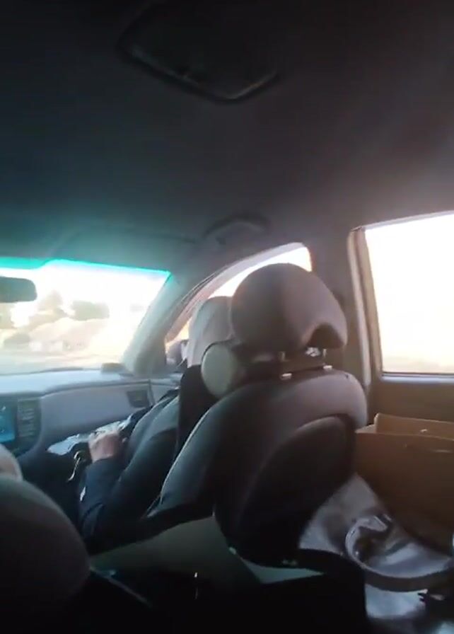 inside of a moving car. A woman wearing a hijab is filming the interior of the car, including the driver and another female passenger. Loud music is playing. The person filming is holding the camera out to the side, towards the other passenger at times. The other passenger is also wearing a hijab. The driver is visible but not clearly seen.