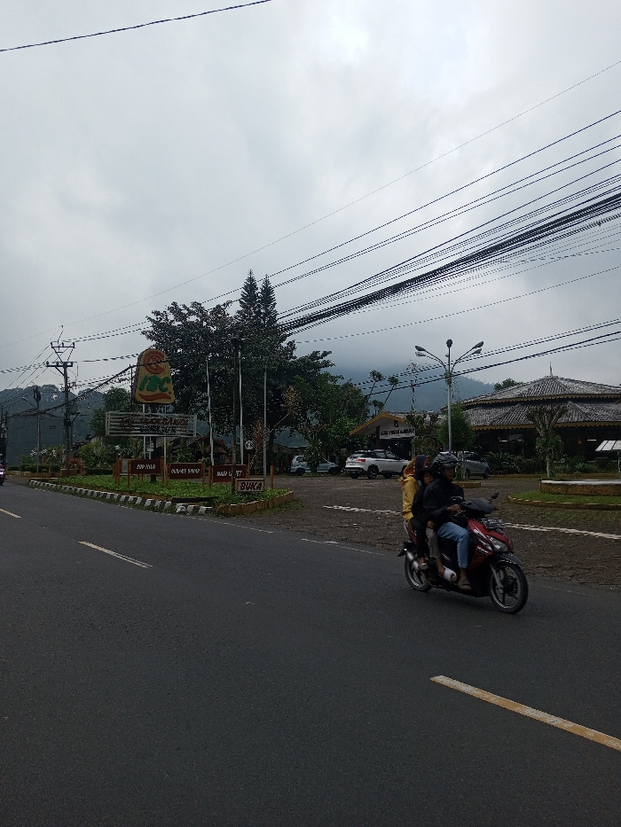 The image depicts an overcast daytime scene on a paved road adjacent to a commercial establishment and natural landscape. The location is near Mount Salak, West Java, Indonesia, as indicated by the sign "LERENG GUNUNG SALAK" and Indonesian words "BUKA" and "MASUK." In the foreground, a dark grey asphalt road is visible with a solid white line on its left edge and a partial yellow center line. Moving from left to right on this road, a dark red motor scooter carries three individuals. The driver, wearing a dark jacket, blue jeans, and a dark helmet, is operating the vehicle. Behind the driver, a passenger in dark attire with a head covering is seated. A third passenger, wearing a bright yellow top, rides at the rear. None of the passengers appear to be wearing helmets. To the right of the road, a raised median with a striped curb separates the road from a roadside area. This area features multiple signs and buildings. A prominent, colorful sign with a green, possibly frog-like, mascot figure in a basket is visible. Below it, a white sign with dark text and another sign structure displaying "MASUK," "OUTLET," and "BUKA" are present. Further right, a building with a distinct multi-tiered, dark-tiled roof and exposed wooden supports stands. Adjacent to this building is a parking area, where at least two white SUVs are visible. The mid-ground features a street lamp with multiple lights. Dense green vegetation, including tall evergreen trees, is scattered throughout the roadside area. Numerous black utility and communication cables are strung overhead across the scene, connected to utility poles on the left. In the background, distant, vegetated mountains are partially obscured by an overcast sky. The sky itself is uniformly light grey, indicating heavy cloud cover.