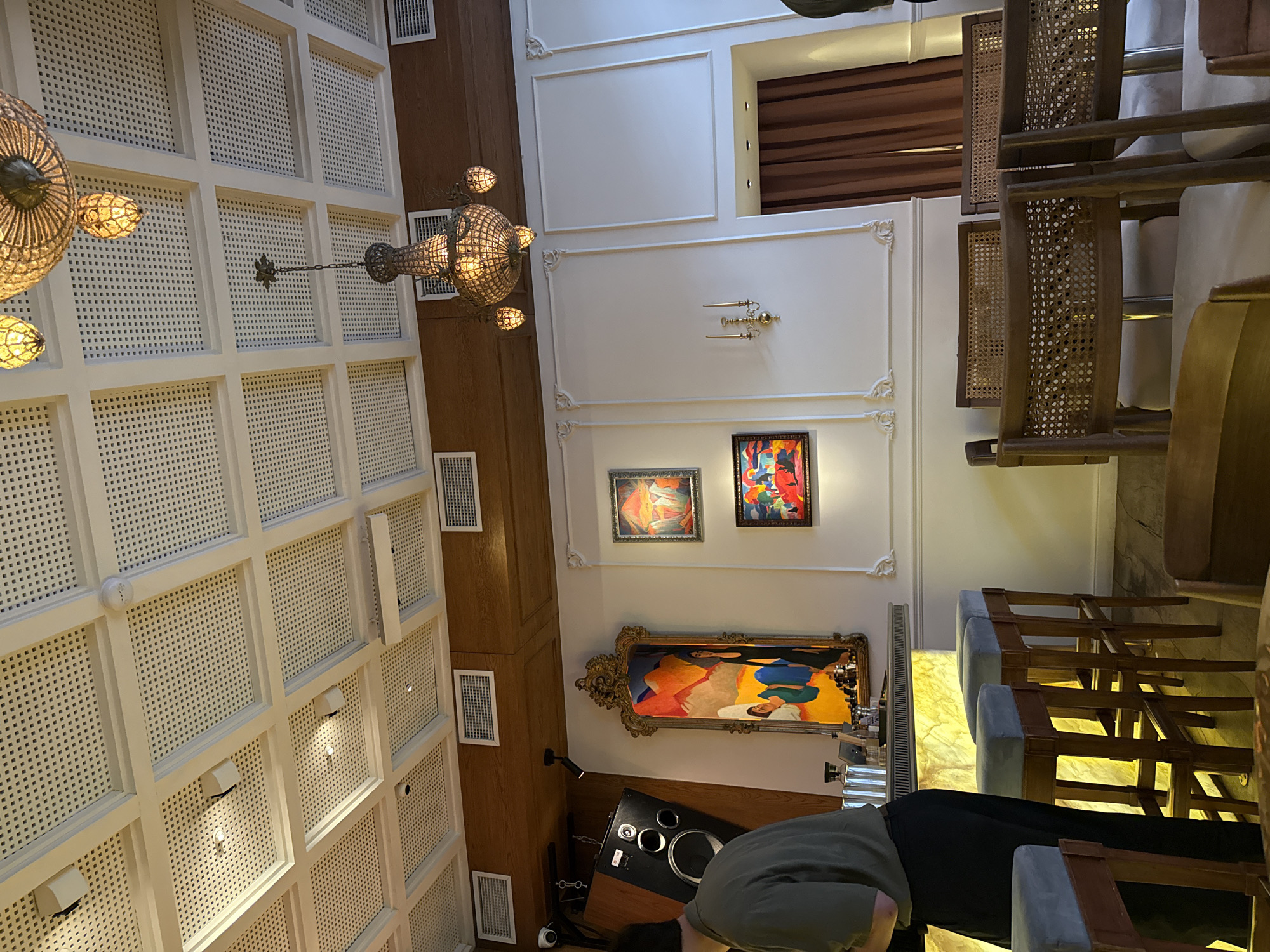 interior of a room with a decorative ceiling and lighting fixtures. There are framed paintings on the wall, and a counter with bar stools is visible. A person is sitting at the counter. The image appears to be taken indoors and is rotated counter-clockwise. No information is discernible that would identify the location as Yerevan, Armenia.