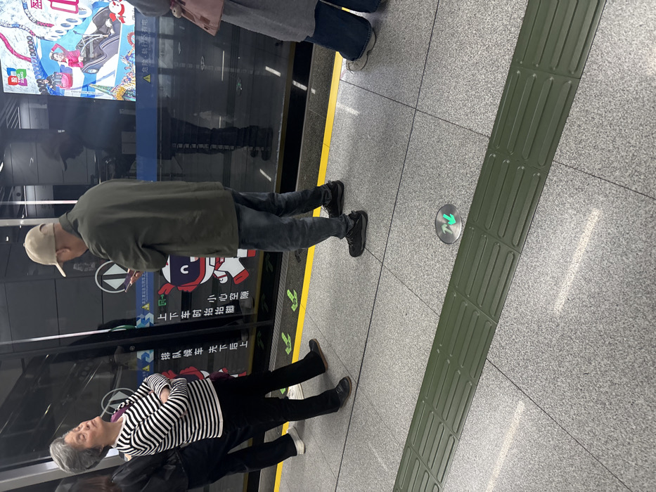 The image captures a scene at a subway station. A poster with an animated character is visible on the train door. Standing on the platform are several individuals, including a man with a beige cap looking at his phone and a woman in a black and white striped shirt. Tactile paving, designed for visually impaired individuals, runs along the platform. There is a green illuminated direction indicator on the floor. Chinese characters are visible on the platform screen door.