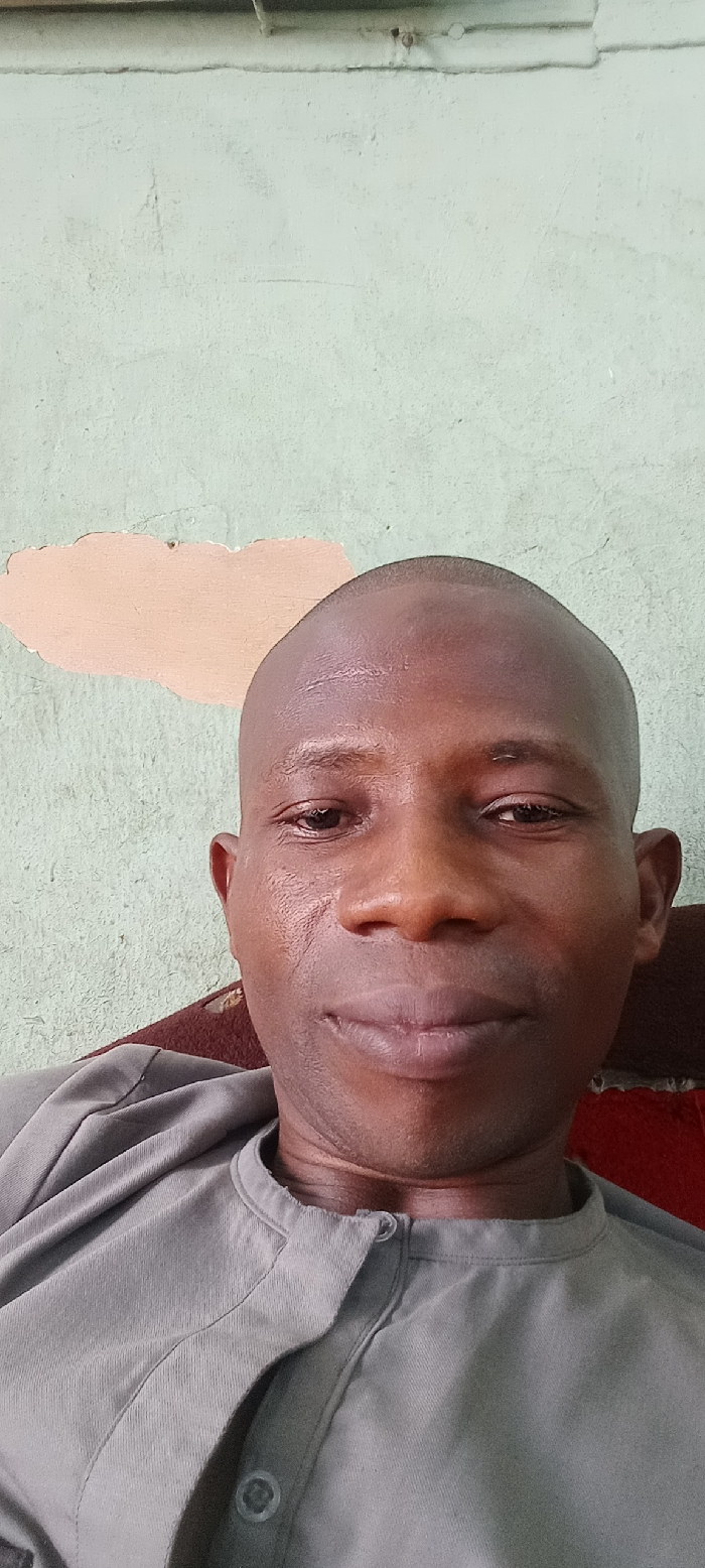 The image displays an adult male, dark-skinned with a closely shaven head, positioned facing the camera with a subtle smile. He is wearing a light grey, long-sleeved garment featuring a band collar and a partial button placket. The background consists of an interior wall painted a pale greenish-blue, which exhibits significant paint peeling, revealing an underlying irregular patch of a peach-toned layer. The wall surface shows texture and minor imperfections. A dark reddish-brown object, consistent with upholstery or furniture, is partially visible behind the subject's left shoulder. Visual information within the image is insufficient to identify the specific location in Lokoja, Nigeria.