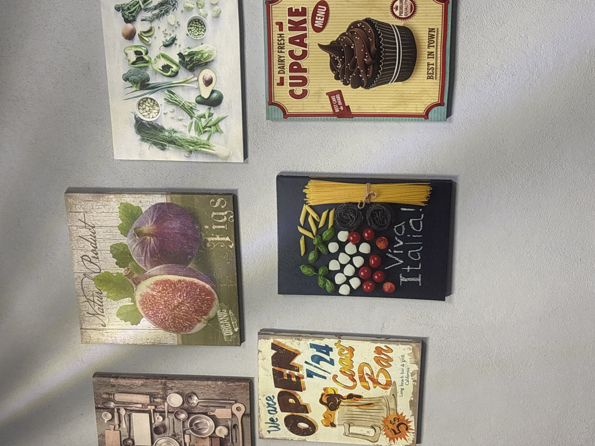 An interior wall in the city of Buenavista, Mexico, is adorned with six rectangular decorative pictures or canvases, arranged in two rows of three. The wall features a light grey, textured finish, with a diagonal shadow visible in the upper left. In the top row, from left to right: 1. A rectangular canvas displays an overhead arrangement of various kitchen utensils and baking equipment on a rustic, distressed wooden background. 2. A rectangular canvas titled "Natural Product Figs" depicts two figs, one cut open to reveal its red interior, against a distressed white wooden plank background. The word "Organic" is also visible. 3. A rectangular canvas features an overhead shot of a variety of green vegetables, including bell peppers, broccoli, avocados, peas in bowls, green onions, and lettuce, arranged on a light-colored surface. In the bottom row, from left to right: 1. A rectangular, vintage-style sign reads "We are OPEN 7/24 Coast Bar" and includes an illustration of a beer mug with "Cold Beer 5$" and text stating "Long beach bar & grill. California." 2. A vertical black canvas titled "Viva Italia!" showcases an arrangement of various Italian food ingredients: fresh basil leaves, small white mozzarella balls, red cherry tomatoes, bundles of dry yellow spaghetti, and coiled dark pasta. 3. A vertical rectangular sign, designed as a menu, advertises "DAIRY FRESH CUPCAKE MENU." It features a large illustration of a chocolate cupcake with sprinkles, accompanied by a "BEST CAKE AWARD" ribbon and a "PREMIUM QUALITY" seal, with "BEST IN TOWN" printed at the bottom. No people are present in the scene, and no actions or interactions are depicted.