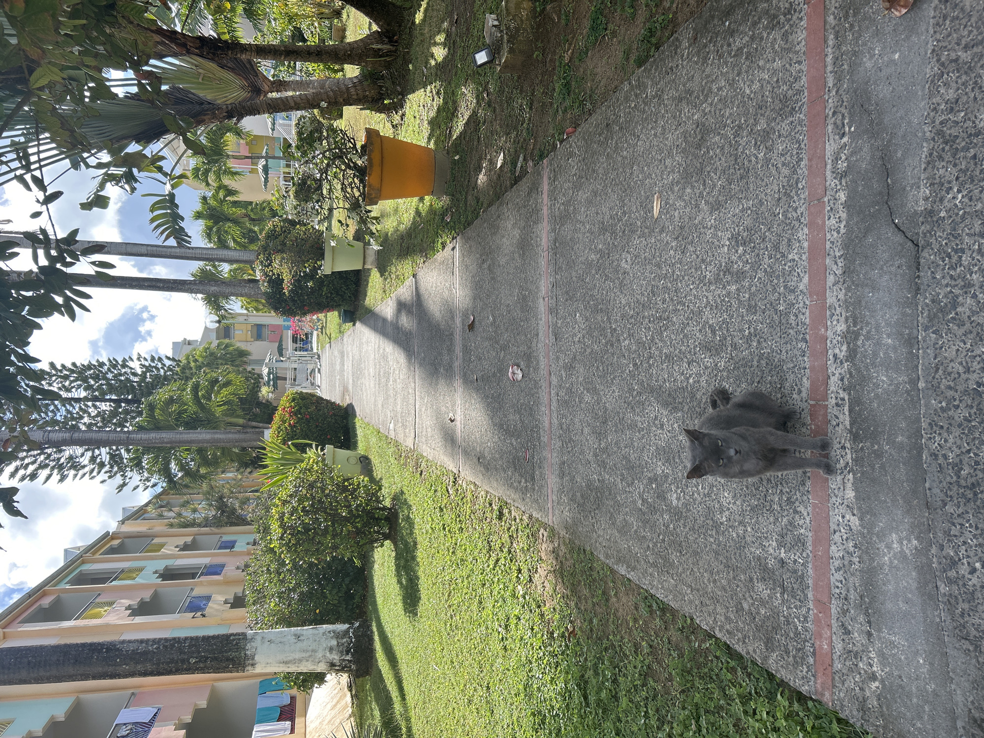 gray cat lying on a concrete walkway in Le Gosier, France. The walkway is lined with grass and plants on one side and a building on the other. The building has multiple stories and is painted in various pastel colors. In the distance, more trees and buildings are visible. The sky is partially cloudy. There are also tree shadows on the walkway.