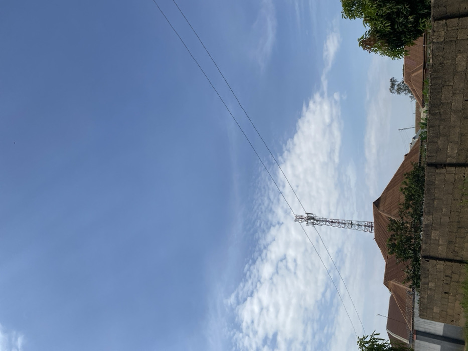 The image depicts an exterior view of a residential area under a partly cloudy blue sky in the city of Du, Nigeria. The upper two-thirds of the frame are dominated by the sky, which transitions from scattered white clouds on the left to clearer blue on the right, with a small, dark speck visible in the upper center. Two parallel black electrical or communication wires traverse the mid-ground diagonally from the upper left to the lower right. A tall, reddish-brown lattice telecommunications tower, equipped with antennae, is centrally positioned, rising above the rooftops. Below and around the tower, several buildings are visible, characterized by multi-pitched roofs constructed from heavily rusted, corrugated reddish-brown metal sheets. In the foreground, a substantial grey concrete block wall, approximately 1.5 meters high, spans horizontally across the lower third of the image. Green foliage, including trees and bushes, is interspersed behind the wall and between the visible structures, particularly on the left and right sides. No individuals are visible. The scene appears to be under daylight conditions.