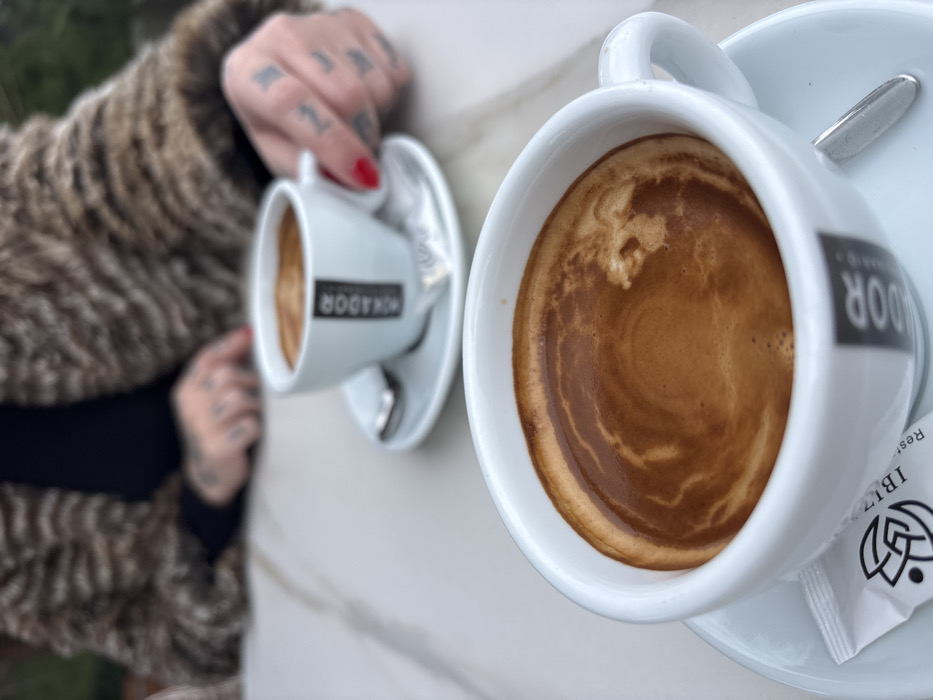 The image displays two white espresso cups on a light-colored, possibly marble, table with subtle veining. The scene is located at an outdoor establishment in Ulcinj - Ulqin, Montenegro. In the immediate foreground, a white cup filled with espresso exhibits a rich brown crema featuring distinct swirling patterns. This cup rests on a white saucer alongside a silver spoon and a white sugar packet labeled "IBIZA IBIZ Rst". Behind this, positioned in the mid-ground and slightly out of focus, is a second white espresso cup, also containing coffee with crema. Both cups bear the branding "MONDOR Milano". This second cup is actively held by the right hand of an individual. The individual is wearing a brown and beige faux fur coat over a black garment. Their right hand features multiple tattoos on the fingers and knuckles, and their fingernails are painted red. A silver spoon and a white sugar packet are also present on the saucer of this second cup. The background is blurred, suggesting an open-air environment with greenery or foliage.