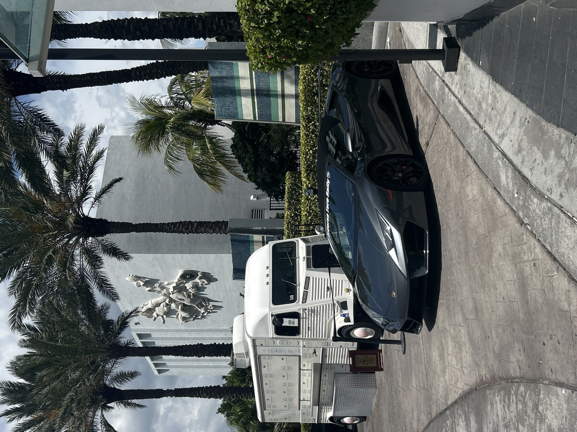 A gray sports car and a white service van are parked on a gray concrete surface, near green hedges and palm trees. The van has a vintage design with the number 049 on its front. A building with a sculpture on its side is visible among the palm trees. The sky is cloudy. The scene conveys a tropical or subtropical environment.