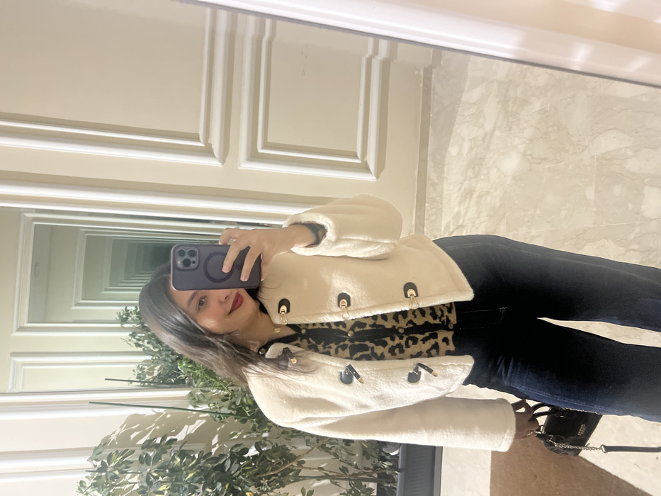 A woman in dark jeans and a cream-colored jacket with decorative closures takes a selfie in a mirror. She wears a leopard-print top underneath. Her dark hair is shoulder-length. The background shows a hallway with repeating door frames due to the mirror effect, a plant with green leaves, and a marble floor. A small black purse with a silver chain strap is also visible.