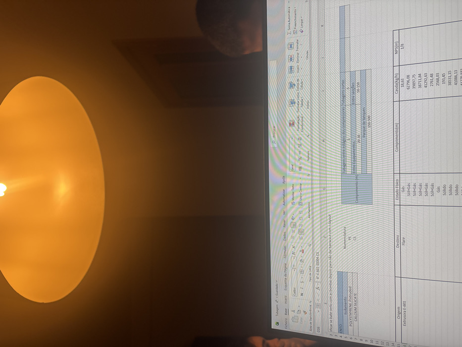 An Excel spreadsheet is displayed on a monitor, showing data entries related to piping systems. Columns include "Numenclatura," "Estado Fisico," "Comprimento (m)," "Cauda (kg/h)," and "NPS (in)." Entries detail various states of matter (gas, solid, mixtures), lengths, flow rates, and pipe sizes. Formulas are visible, with a specific line reading: "ificar se bate certo com as bombas depois para não dar barraca e com o layout," indicating a check for proper pump integration. The spreadsheet is titled with Portuguese-language menus.
