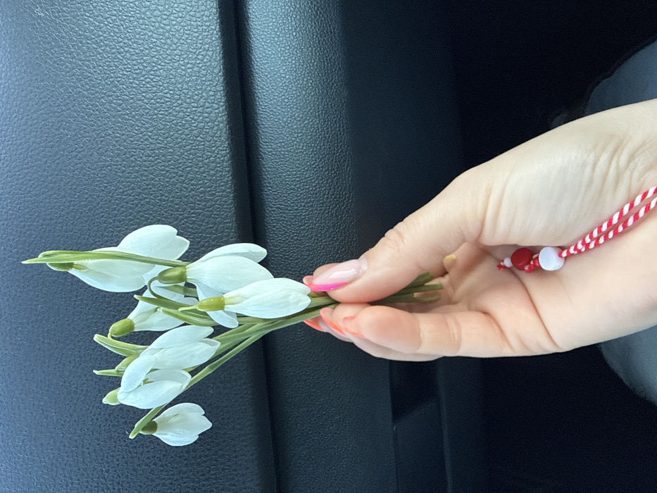 The scene, located in the city of Zornitsa, Bulgaria, depicts a human hand holding a small bouquet of approximately eight white snowdrop flowers with green stems. The hand has light skin and manicured fingernails, featuring pink-tipped French manicure on some digits and a solid coral polish on the thumb. A red and white braided string bracelet, adorned with small red and white beads (a Martenitsa), is suspended from the wrist area. The background consists of a dark, textured surface indicative of an automotive interior, likely a dashboard or door panel.