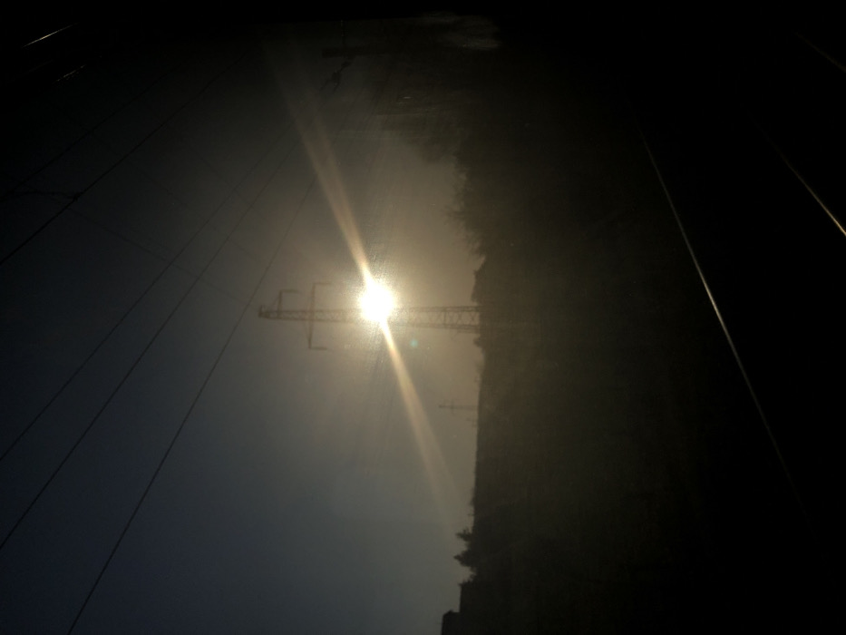 The image displays an outdoor scene in Dettwiller, France, characterized by strong backlighting during either sunrise or sunset. A prominent lattice-style electrical transmission tower stands centrally in the mid-ground, largely silhouetted, with a brilliant sun positioned directly behind its upper structure. Intense solar glare and a horizontal lens flare extend across the image from this light source. A smaller, similar transmission tower is faintly visible further in the background to the left. The horizon consists of a dark, indistinct landmass, possibly a hill, topped with sparse, silhouetted vegetation. A dark building silhouette is present on the far left. Several dark, thin power lines traverse the upper sky. The foreground is heavily shadowed, revealing two faint, parallel diagonal lines consistent with railway tracks. No individuals are present. The atmosphere appears hazy or diffused.